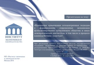 Документ описывает проект по применению сетецентричных подходов для укрепления взаимодействия между гражданским обществом и властью в России. Основные цели включают анализ международного опыта и разработку моделей участия граждан в принятии государственных решений. Проект направлен на развитие электронной демократии и улучшение процессов общественного участия через современные информационные технологии.