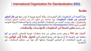 أمن المعلومات أصبح ضرورة ملحة للمؤسسات في ظل التطور التكنولوجي وتزايد أساليب الهجوم. تأسست المنظمة الدولية للتوحيد القياسي (ISO) في عام 1947 لوضع معايير لأمن المعلومات، وأصدرت مجموعة من المعايير تحت نطاق ISO 27000، من أبرزها ISO 27001 وISO 27002 التي تتناول إدارة أمن المعلومات وتقييم المخاطر. تهدف هذه المعايير إلى تهيئة نظم أمن معلومات فعالة وتحديد الإجراءات وتوزيع المسؤوليات لضمان حماية البيانات.