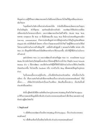 ในยุคที่เทคโนโลยีการสื่อสารผ่านอินเทอร์เน็ต กาลังเป็นที่นิยมและมีผลกระทบในทุกๆ ด้านในปัจจุบัน ทาให้ทุกคน ทุกสังคมต้องมีการปรับตัว และพัฒนาให้ทันต่อการเปลี่ยน เปลี่ยนแปลงในโลกของการสื่อสาร และการพัฒนาของโลกเวิลด์ไวด์เว็บ (World Wide Web; WWW) จากยุคแรก คือ Web 1.0 ซึ่งมีลักษณะเป็น Static Web คือมีการนาเสนอข้อมูลทางเดียว (one-way communication) ด้วยการแปลงข้อมูลข่าวสารที่มีอยู่รอบตัวเราให้อยู่ในรูปของดิจิตอล (Digital) เช่น หนังสือพิมพ์ นิตยสาร หรือการโฆษณาตามหน้าเว็บไซต์ โดยผู้ใช้สามารถอ่านได้แต่ ไม่สามารถเข้าร่วมในการสร้างข้อมูลได้ แต่เมื่อก้าวเข้าสู่ยุคที่ 2 ของเทคโนโลยีคือ WWW หรือ Web 2.0 เป็นยุคที่ทาให้อินเทอร์เน็ตมีศักยภาพในการใช้งานมากขึ้น เน้นให้ผู้ใช้มีส่วนร่วมในการ สร้างสรรค์ จุดกาเนิดของ Web 2.0 และการพัฒนาก้าวผ่านเข้าสู่ยุค Web 3.0 ความนิยมขอ Social Media มีการเติบโตอย่างไม่หยุดยั้งและมีแนวโน้มของผู้ใช้บริการทั่วโลก ปัจจุบัน Social Network Website ต่าง ๆ ก็มีการพัฒนา และเปิดโอกาสให้ผู้ใช้ได้เข้าไปมีส่วนร่วมในการใช้ประโยชน์เชิง สังคมกันมากขึ้น ไม่ว่าจะเป็น Facebook หรือ การสร้างเว็บ Blog เพื่อเผยแพร่ข้อมูลในรูปแบบ ต่างๆ ในเรื่องของเนื้อหาความรู้เกี่ยวกับ......(เรื่องที่นักเรียนนามาทาบทเรียน หรือเนื้อหาในเว็บ บล็อก) นั้น เป็นความสนใจส่วนตัวที่อยากจะศึกษาเรื่องราวส่วนประกอบของคอมพิวเตอร์ ซึ่งมี เนื้อหา......... (ก็เขียนไปว่านักเรียนนาเรื่องอะไรมาศึกษา เขียนเป็นเนื้อหาย่อๆๆ เกี่ยวกับเรื่องที่ นามาทาเป็นบทเรียน) ดังนั้น ผู้จัดทาจึงได้มีความคิดที่จะนาเอารูปแบบของ WebBlog ด้วยเว็บไซต์ Wordpress มาใช้ในการเผยแพร่ข้อมูลที่เกี่ยวข้องกับ ส่วนประกอบของคอมพิวเตอร์ เพื่อ ศึกษา เผยแพร่ความรู้ ดังกล่าวสู่ผู้สนใจต่อไป 7. วัตถุประสงค์ 7.1 เพื่อศึกษาและพัฒนาเว็บบล็อก (WebBlog) ด้วย Wordpress เรื่อง ส่วนประกอบของ คองพิวเตอร์ 7.2 เพื่อศึกษาค้นคว้าเรื่องที่สนใจเกี่ยวกับ ส่วนประกอบของคอมพิวเตอร์