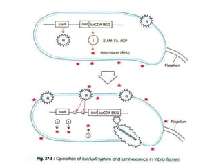 Two-component regulatory systems allow bacteria to sense and respond to their environment through signal transduction. They typically consist of a membrane-bound histidine kinase that senses an external stimulus and phosphorylates a response regulator protein. The response regulator then mediates the cellular response, usually through differential gene expression. Phosphorylation is achieved through the transfer of a phosphoryl group from ATP to the histidine kinase, and then to an aspartic acid residue on the response regulator. This system enables adaptation to various stresses, growth conditions, and environmental changes.