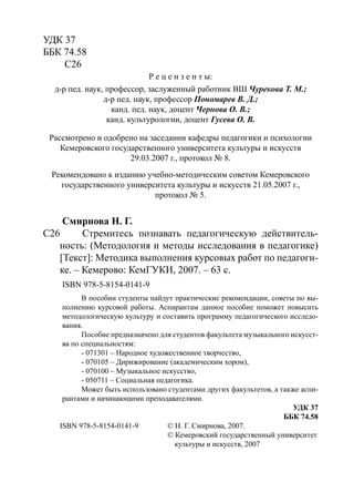 Методическое пособие Н. Г. Смирновой предназначено для студентов 2 и 3 курсов разных специальностей, обучающихся в Кемеровском государственном университете культуры и искусств, и содержит практические рекомендации для выполнения курсовых работ по педагогике. Пособие затрагивает методологию и методы исследования, а также предлагает конкретные этапы выполнения научных работ. Цель пособия — повысить методологическую культуру и помочь студентам и аспирантам в освоении основ научного исследования.