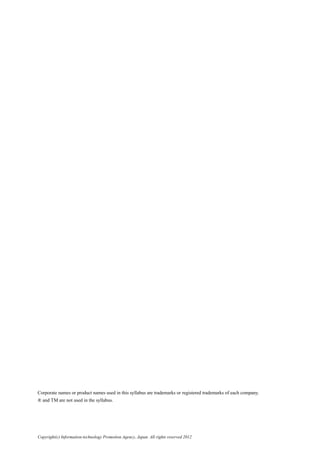 This document outlines the knowledge required to pass the Information Technology Engineers Examination in Japan. It is organized into 9 major categories covering topics such as corporate strategy, business strategy, system strategy, development technology, project management, and basic computer science theory. Each major category contains multiple middle categories that further break down the knowledge into specific items. For each item, the document provides a goal statement describing what should be learned and descriptions with sample terms and examples. The purpose is to guide examinees in their preparation and provide instructional guidelines for companies and schools.