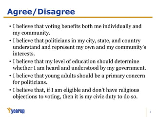 This document discusses the importance of civic engagement and voting among young adults. It notes that politics is dominated by the wealthy, old, and educated, while young adults face low voter turnout and limited advocacy for their priorities. When certain groups do not vote or engage civically, politicians have less incentive to address their concerns. However, data shows that over 80% of eligible Year Up students voted in 2012, a far higher rate than other millennials. The document encourages civic participation through voting and advocacy.