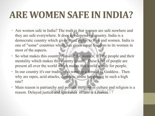 2) While India has strong laws against rape, domestic abuse, and acid attacks, enforcement remains a challenge due to patriarchal attitudes, delayed justice system, and politicians prioritizing other issues over women's safety.