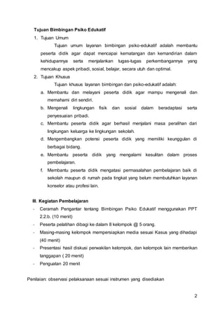 Modul ini membahas konsep dan pelaksanaan layanan bimbingan psiko-edukatif di sekolah dasar. Layanan ini bertujuan membantu perkembangan peserta didik secara optimal dalam aspek pribadi, sosial, dan belajar. Guru kelas melaksanakan layanan ini melalui kegiatan klasikal maupun individual seperti bimbingan kelompok, konsultasi, dan kunjungan ke rumah orang tua. Layanan ini mencakup bidang pribadi, sos