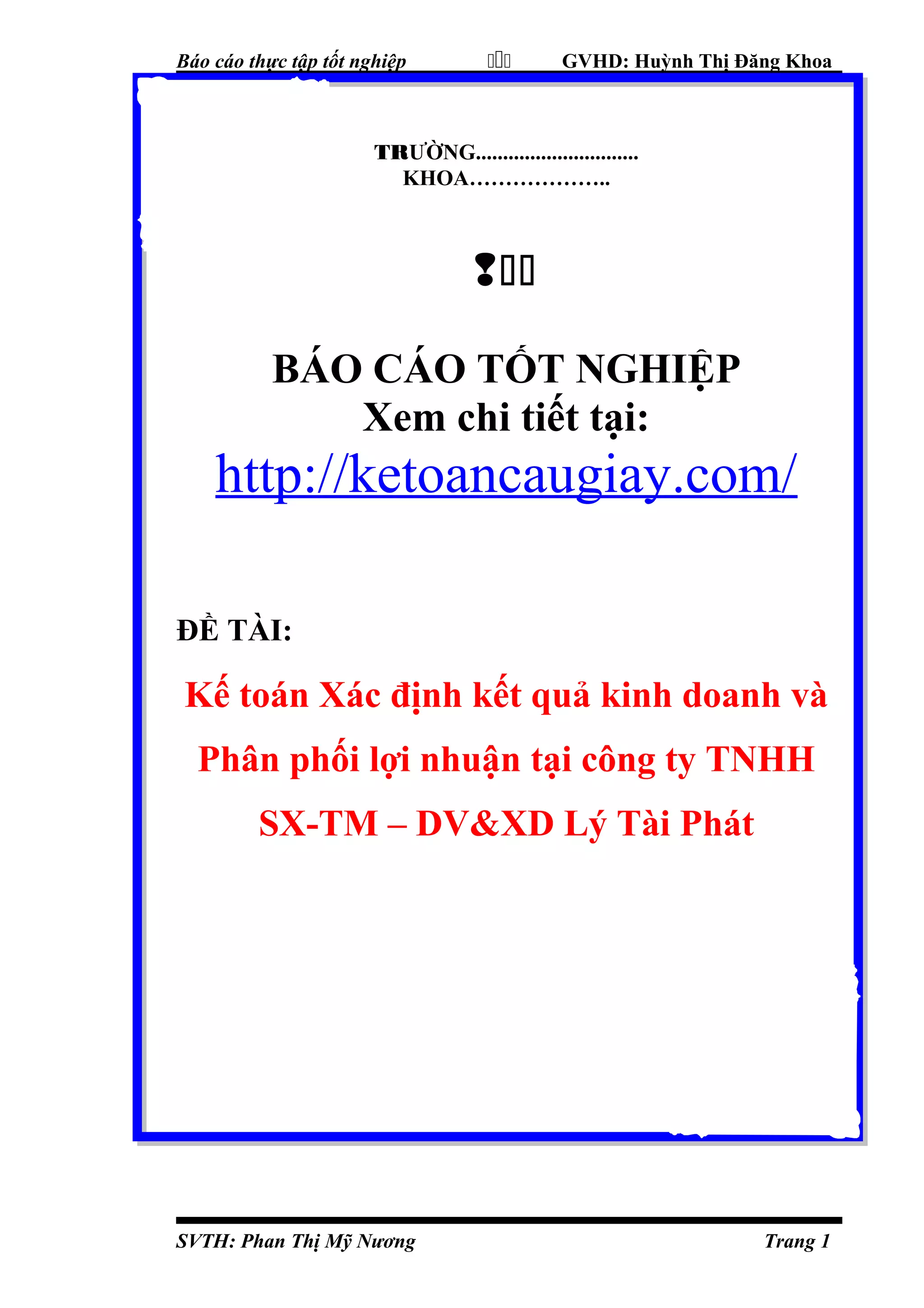 Báo cáo thực tập tốt nghiệp của sinh viên Phan Thị Mỹ Nương, tập trung vào kế toán xác định kết quả kinh doanh và phân phối lợi nhuận tại công ty TNHH SX-TM-DV&XD Lý Tài Phát. Mục tiêu nghiên cứu nhằm so sánh giữa lý thuyết và thực tiễn kế toán, từ đó rút ra những kinh nghiệm cho công tác sau này. Nghiên cứu sử dụng phương pháp thu thập số liệu qua chứng từ và sổ kế toán, nhằm đánh giá hiệu quả kinh doanh của công ty trong một năm hoạt động.