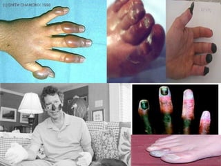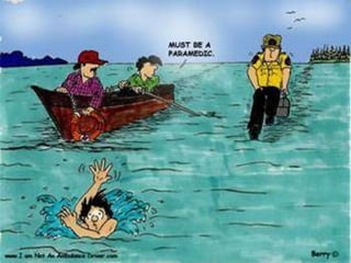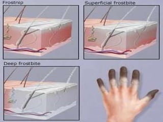 The document discusses various environmental emergencies including heat-related illnesses, hypothermia and cold injuries, bites and stings, and water-related emergencies. It describes the predisposing factors, signs and symptoms, and treatment approaches for these conditions. The key aspects of patient assessment and care are to remove them from the dangerous environment, monitor for changes in mental status and vital signs, provide oxygenation and cooling or warming as indicated, and rapidly transport to definitive care.