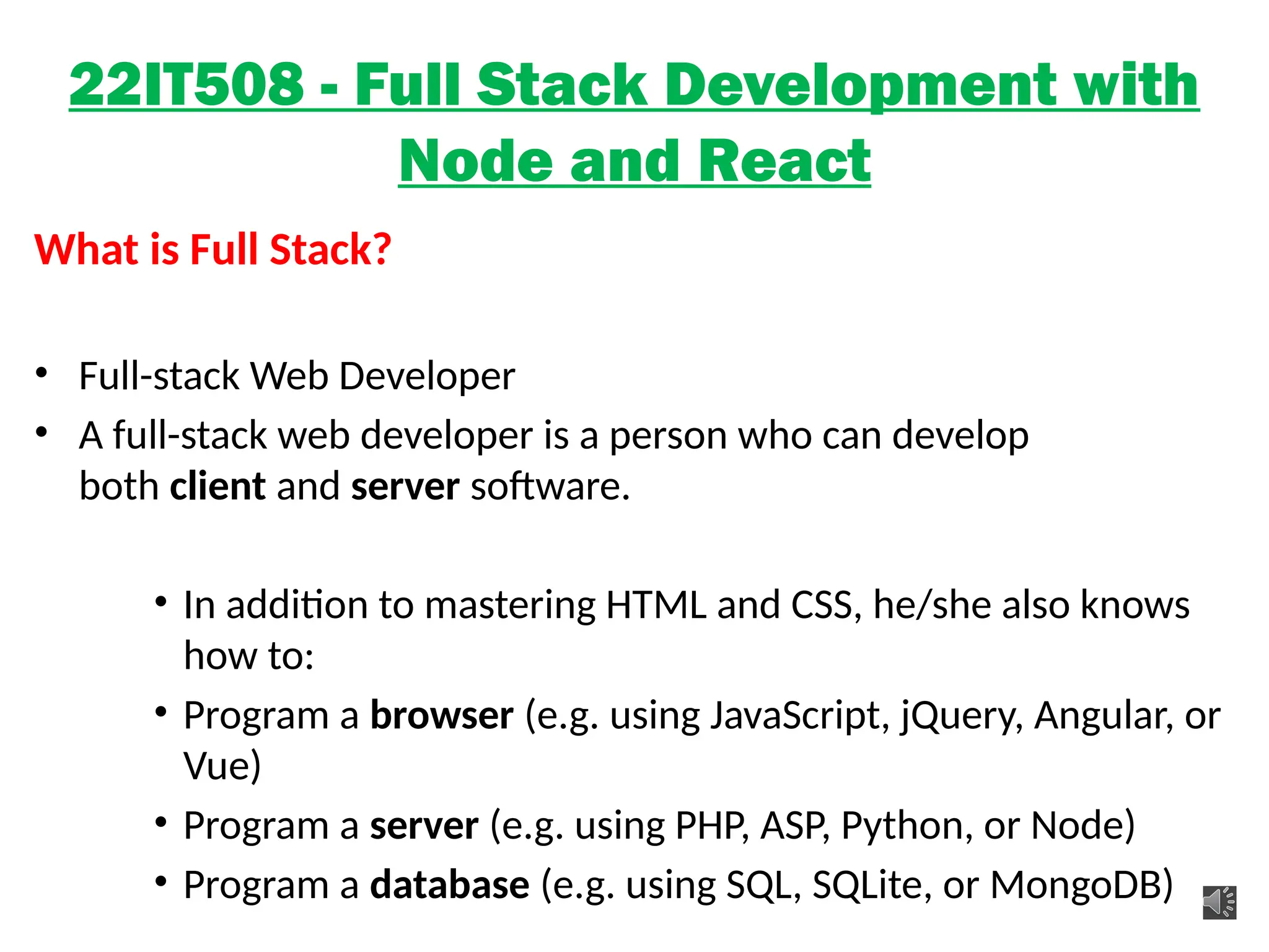 The presentation “22IT508 - Full Stack Development with Node and React” provides an overview of the concepts, tools, and technologies involved in building modern web applications using Node.js for backend development and React.js for frontend development. It covers: