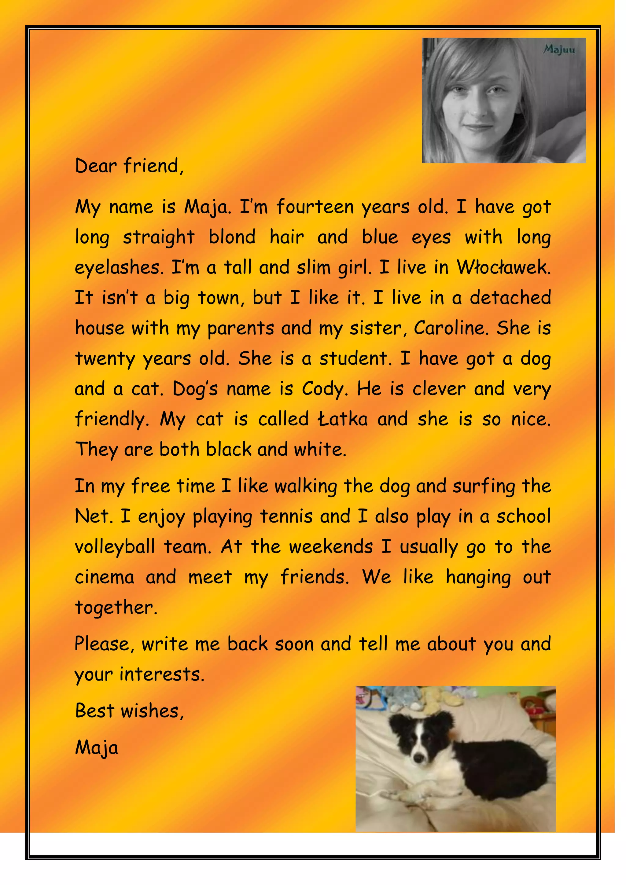 Maja is a 14-year-old girl who lives in Włocławek, Poland with her parents and 20-year-old sister Caroline, who is a student. Maja has long blond hair, blue eyes, and owns a friendly black-and-white dog named Cody and cat named Łatka. In her free time, Maja enjoys walking Cody, surfing the internet, playing tennis, volleyball with her school team, and hanging out with friends at the cinema on weekends. She asks the reader to write back and share information about themselves.