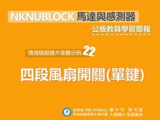 本文件介绍了臺中市南屯區大墩國小的卫星基地,重点在于利用感测组件和程序逻辑构建四段风扇开关的模拟情境。文档详细阐述了操作流程、风速切换机制和潜在解决方案,以保证风扇在不同风速间的平稳切换与控制。此学习简报旨在展示如何通过可编程硬件和软件进行教育实践。