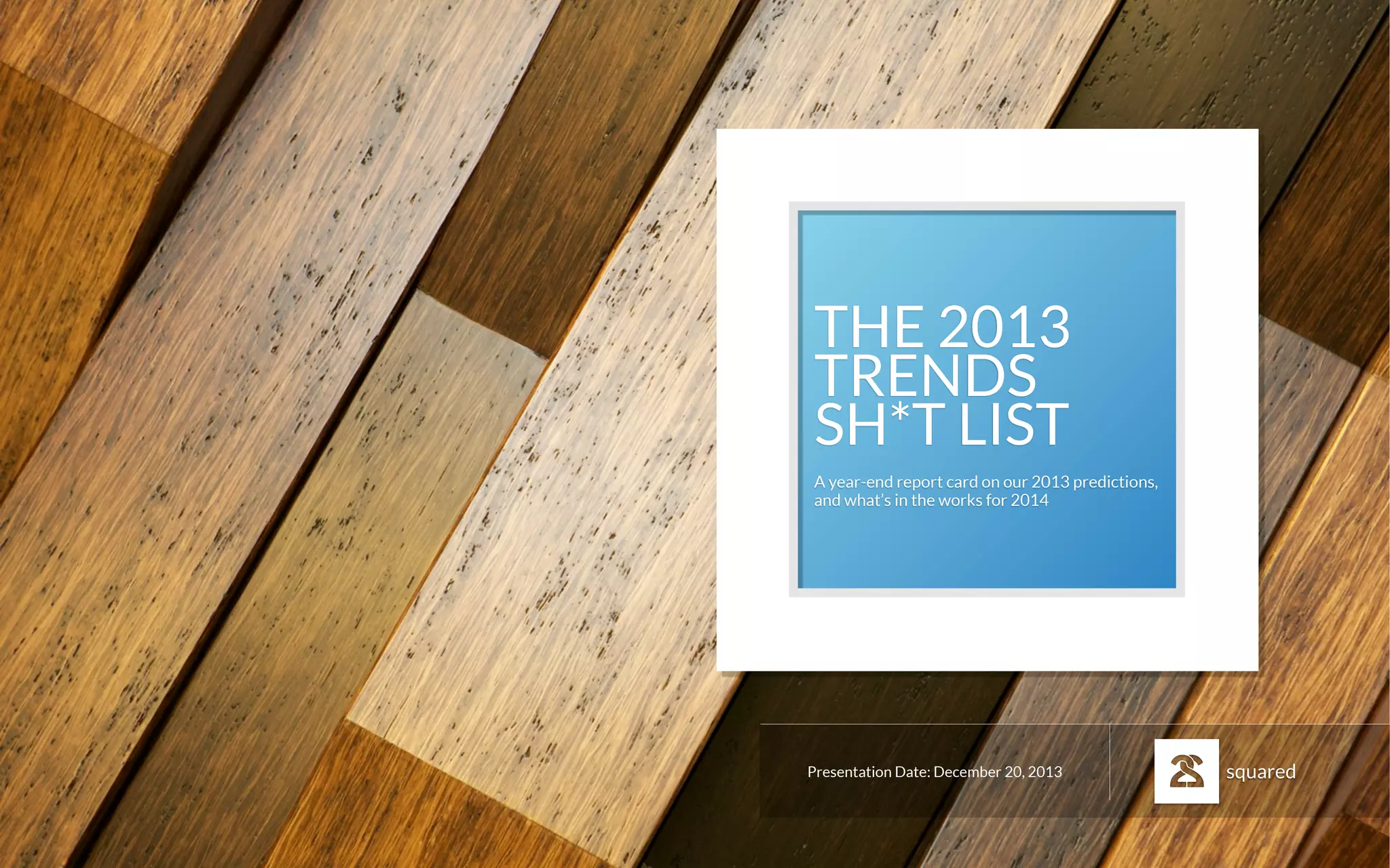 The 2013 Trends Sh*t List by 22squared reflects on the accuracy of predictions made for the year and discusses key trends in consumer behavior, media, technology, and shopping. The report emphasizes the importance of accountability in trend forecasting and how consumer expectations for transparency and personalized experiences have evolved. Insights are provided on various market dynamics, including the blurring lines between general and Hispanic markets, the need for tangible connections in social media, and the shift towards experience-driven consumerism.