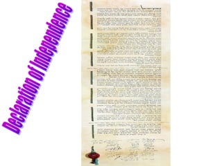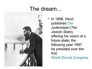 The document outlines key events in the history of Israel from its founding in 1948 to 2008. It notes that in 1896, Theodor Herzl published "The Jewish State" outlining his vision for a Jewish homeland. In 1897, he presided over the first World Zionist Congress. On May 14, 1948, Israel declared independence as the British Mandate ended and was immediately invaded by neighboring Arab states, beginning the War of Independence. Armistice agreements were reached in 1949 and Israel joined the UN. Subsequent events include the Six-Day War in 1967 and peace treaties with Egypt in 1979.