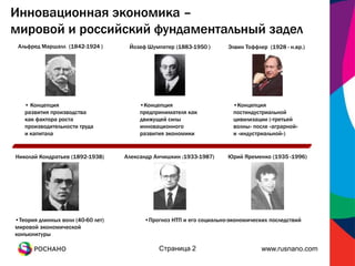 Документ обсуждает необходимость создания инновационной экономики в России, акцентируя внимание на недостатках как советской, так и современной российской экономики в этой сфере. Отмечаются достижения и неудачи в области научно-технического прогресса, а также необходимость пересмотра законодательства для поддержки инновационной деятельности. В заключение подчеркивается важность политической воли и фундаментальных рыночных институтов для успешной трансформации экономики в инновационную.