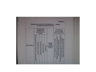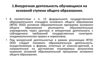 Документ посвящен механизму реализации внеурочной деятельности обучающихся на основной ступени общего образования, включая понятие и задачи внеурочной деятельности, а также организационные модели для ее реализации. Основное внимание уделяется планированию и анализу внеурочной деятельности, ее результатам и образовательным программам. Рассматриваются различные уровни образовательных результатов и механизмы финансирования внеурочной деятельности в образовательных учреждениях.