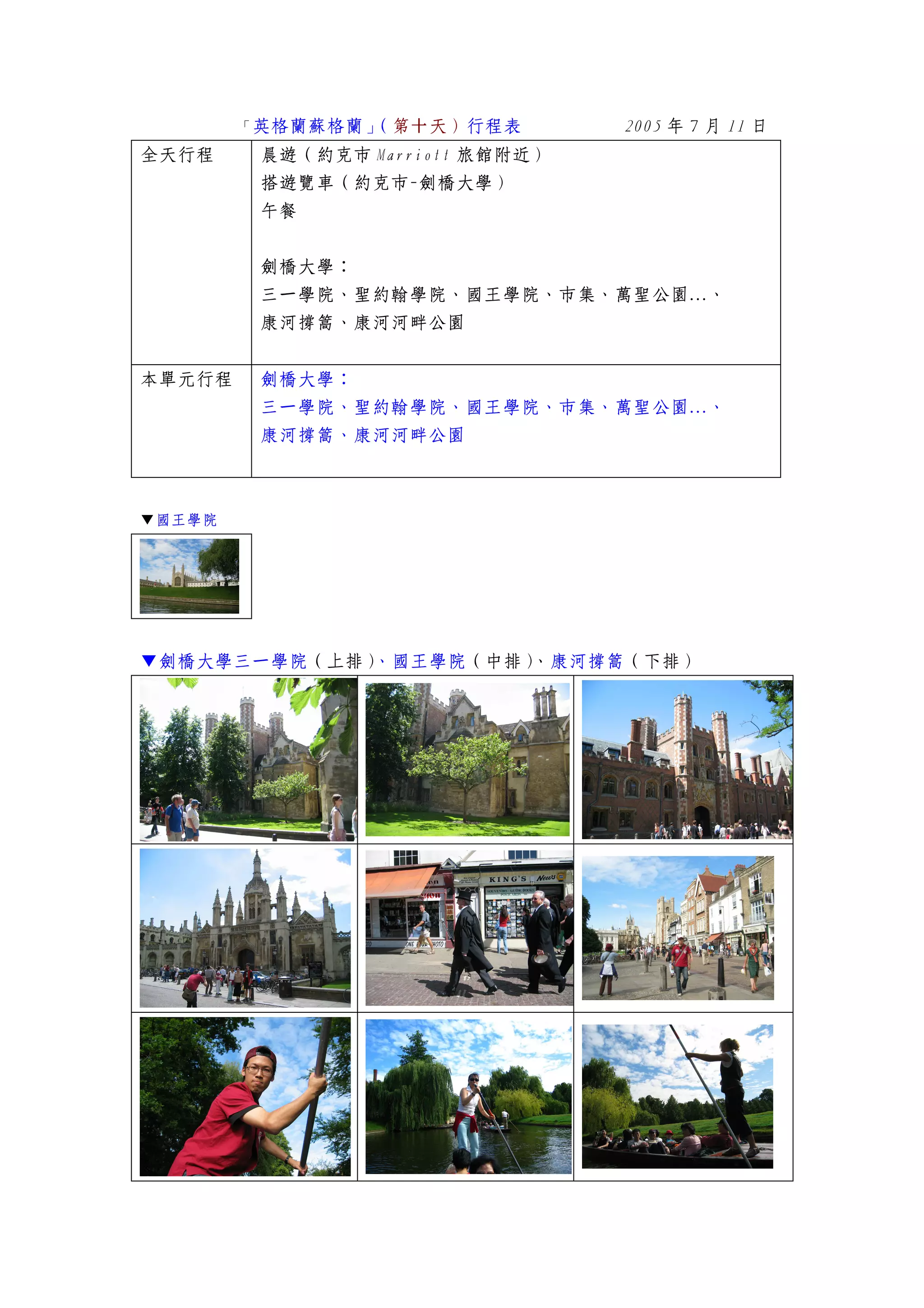 在2005年7月11日的行程中,游览了剑桥大学,包括三一学院、圣约翰学院和国王学院,并进行了康河撑篙。此行程结合了自由活动,在校园内的名胜和历史进行探索,且介绍了著名科学家牛顿的贡献与经历。游览过程中参与者们体验了剑桥的文化与风景,感受到浓厚的学术氛围。