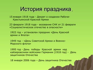 Документ описывает историю праздника Дня защитника Отечества, который отмечается 23 февраля и был установлен по инициативе советского правительства в 1922 году. Он отмечает важные исторические события, связанные с созданием Красной армии и её победами, а также упоминает традиции празднования, которые имеют глубокие корни в российской культуре. Праздник считается символом мужества и патриотизма и отмечается в России и других постсоветских странах.