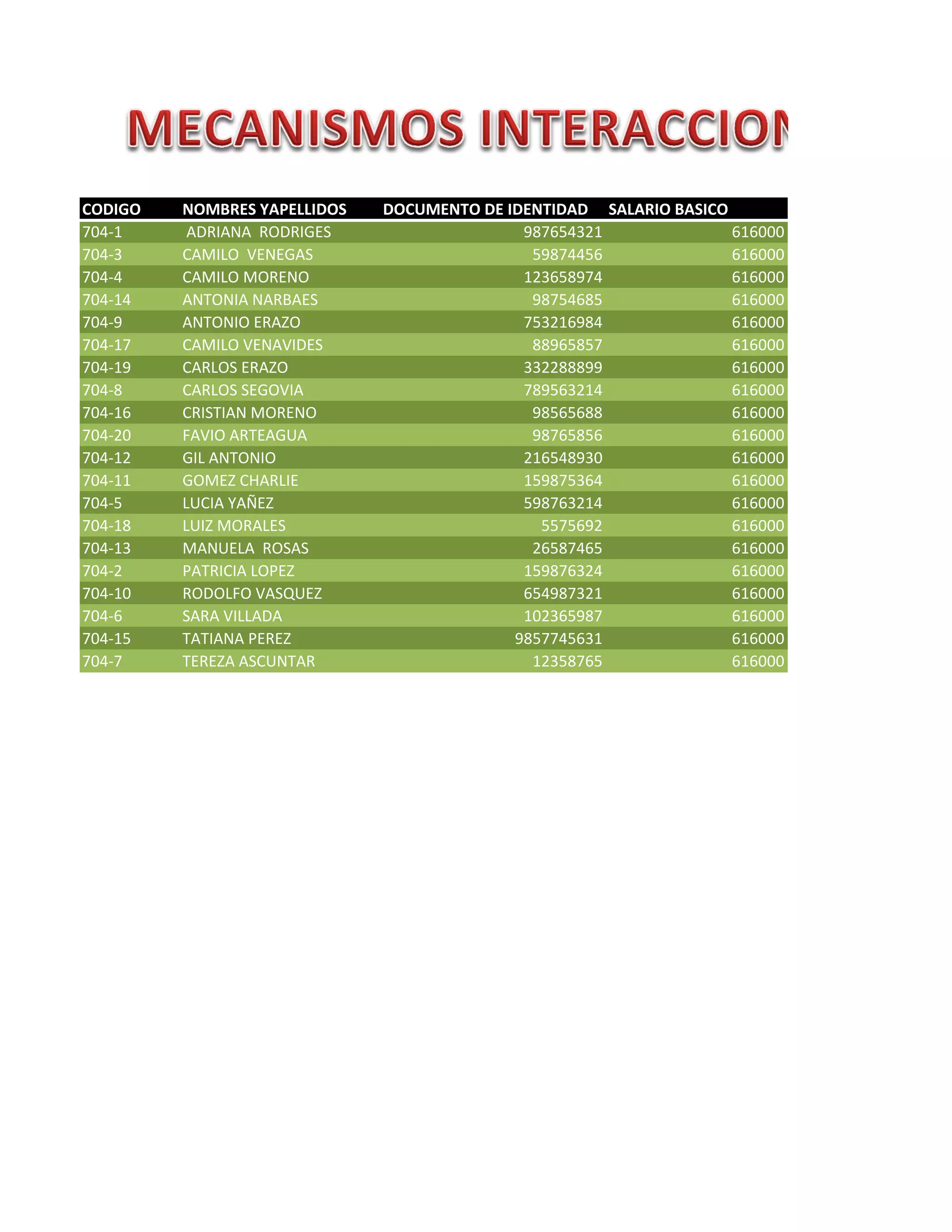 DOCUMENTO DE IDENTIDAD SALARIO BASICO 704-1 ADRIANA RODRIGES 987654321 616000 704-3 CAMILO VENEGAS 59874456 616000 704-4 CAMILO MORENO 123658974 616000 704-14 ANTONIA NARBAES 98754685 616000 704-9 ANTONIO ERAZO 753216984 616000 704-17 CAMILO VENAVIDES 88965857 616000 704-19 CARLOS ERAZO 332288899 616000 704-8 CARLOS SEGOVIA 789563214 616000 704-16 CRISTIAN MORENO 98565688 616000 704-20 FAVIO ARTEAGUA 98765856 616000 704-12 GIL ANTONIO 216548930 616000 704-11 GOMEZ CHARLIE 159875364 616000 704-5 LUCIA YAÑEZ 598763214 616000 704-18 LUIZ MORALES 5575692 616000 704-13 MANUELA ROSAS 26587465 616000 704-2 PATRICIA LOPEZ 159876324 616000 704-10 RODOLFO VASQUEZ 654987321 616000 704-6 SARA VILLADA 102365987 616000 704-15 TATIANA PEREZ 9857745631 616000 704-7 TEREZA ASCUNTAR 12358765 616000