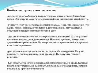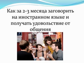 Документ описывает методику быстрого овладения иностранным языком за 2-3 месяца, ориентированную на людей, сомневающихся в своих языковых способностях. В нем предлагаются инструменты для создания условий практики, а также рекомендации по общению с носителями языка, включая использование подсознания. Также содержатся ответы на часто задаваемые вопросы, касающиеся запоминания слов и преодоления страха общения.