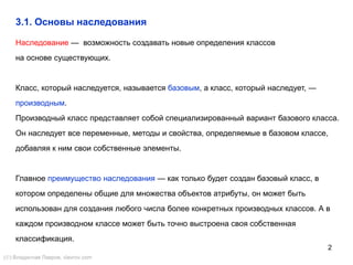 Документ обсуждает основные концепции наследования и полиморфизма в объектно-ориентированном программировании. Он объясняет, как производные классы наследуют свойства и методы базовых классов, а также описывает концепции классического и делегированного наследования, а также различные методы управления доступом к членам класса. Также рассматриваются абстрактные классы и методы, полиморфизм и их применение в реальных приложениях.