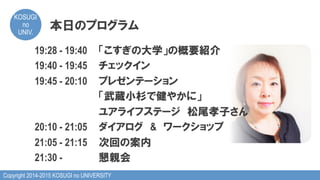「武蔵小杉で健やかに」と題して、ユアライフステージ代表 松尾孝子さんを先生役としてお迎えしました。松尾孝子さんから生活習慣の見直しやアンチエイジングライフについてご紹介していただいた後、参加者の方々とダイアログやワークショップを通じて理解を深めました。(2015年7月10日開催)