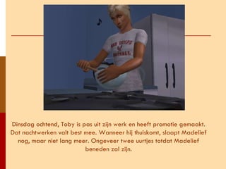 Dinsdag ochtend, Tobyis pas uit zijn werk en heeft promotie gemaakt. Dat nachtwerken valt best mee. Wanneer hij thuiskomt, slaapt Madelief nog, maar niet lang meer. Ongeveer twee uurtjes totdat Madelief beneden zal zijn.