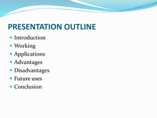 RFID is a technology that uses radio waves to automatically identify objects. It consists of RFID tags attached to objects and RFID readers that can read the tags. RFID tags contain antennas to receive and transmit radio signals to readers, which can then pass the identification information from the tag to backend computer systems. Common applications of RFID include inventory tracking, access control, payment systems, and monitoring of assets or animals. Advantages include contactless and fast identification of multiple tags, while disadvantages include potential impacts from environmental factors and cost of implementation. The future of RFID may include more uses in healthcare, retail, and smart home applications.