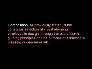 This document discusses the principles of visual composition. It defines composition as the conscious selection and arrangement of visual elements using guiding principles to achieve a desired result. The three main elements of composition are emphasis, balance, and continuity. Balance refers to the equilibrium of opposing or interacting forces within a visual field. There are two categories of balance: formal symmetry, which involves equal distribution across an axis, and informal symmetry, which uses similar but not identical distribution. The document provides examples of different types of formal symmetries like true, virtual, radial, and crystallographic symmetry.