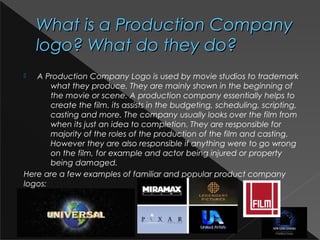 This document discusses various aspects of film production and distribution. It addresses questions about choosing a production company logo, the role of a film distributor, funding options, and influences from other films. The production company logo is meant to represent the genre and vision of the film. A film distributor's job is to promote and secure screenings for the film internationally. British Film Institute funding could support the production. Films like 300, Sinister and Saw have influenced the creator by providing entertaining blends of horror and action.