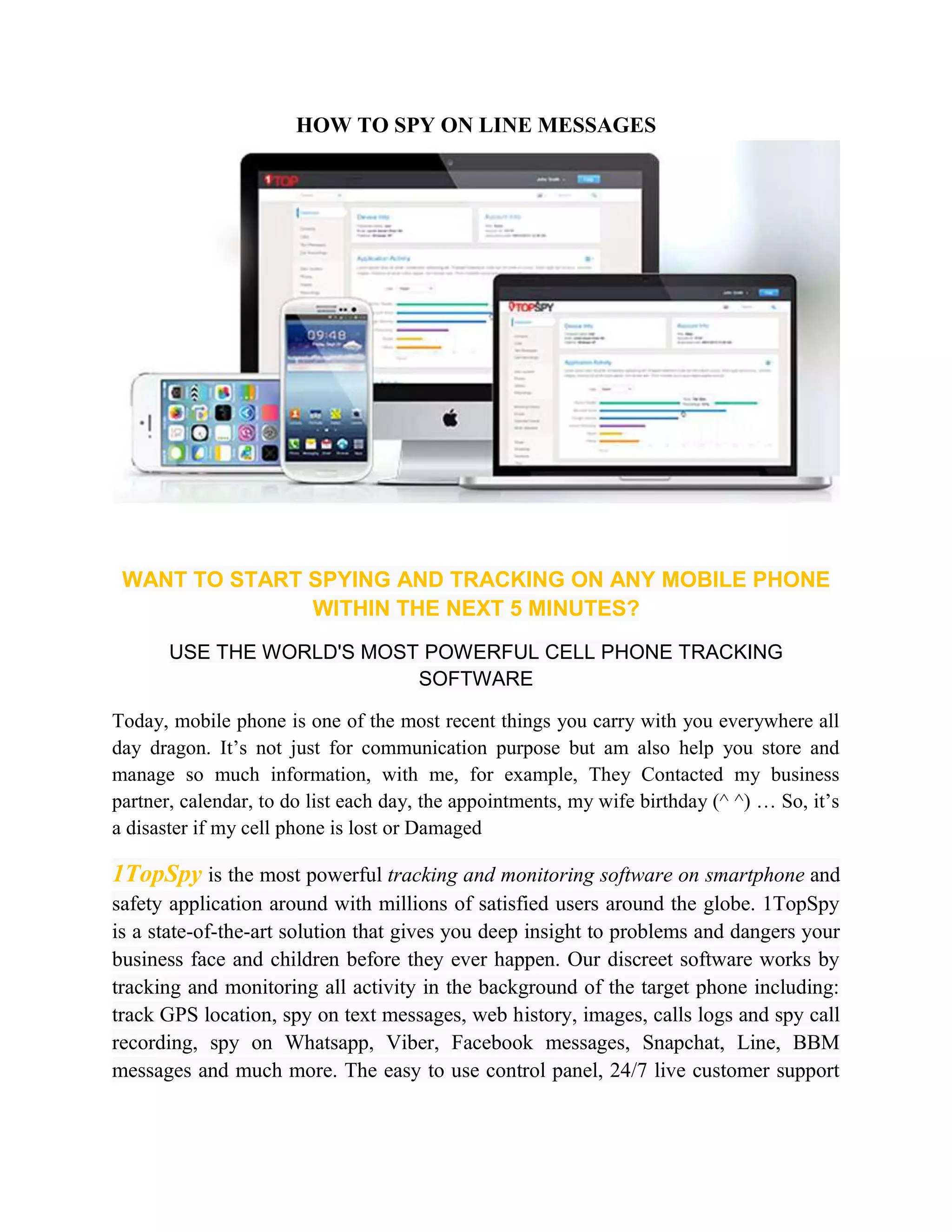 This document describes how to use 1TopSpy software to spy on mobile phones within 5 minutes. 1TopSpy is presented as powerful tracking and monitoring software that can track GPS location, read messages on apps like WhatsApp, Facebook, Line and SMS texts, see call history and recordings, internet browsing history, and photos without the target phone being rooted. The document provides instructions on downloading and installing 1TopSpy on the target phone, then logging into the 1TopSpy website to begin monitoring. Customer testimonials praise 1TopSpy for helping worried parents and keeping track of corporate employee activity.
