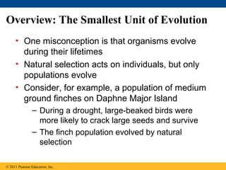 The document summarizes key concepts from Chapter 23 of Campbell Biology about the evolution of populations. It discusses how genetic variation within and between populations arises from mutations, genetic recombination during sexual reproduction, and other processes. The Hardy-Weinberg principle is introduced, stating that allele and genotype frequencies remain constant in a population not experiencing evolutionary influences like natural selection, genetic drift, or gene flow. Factors maintaining or disrupting Hardy-Weinberg equilibrium are also reviewed.