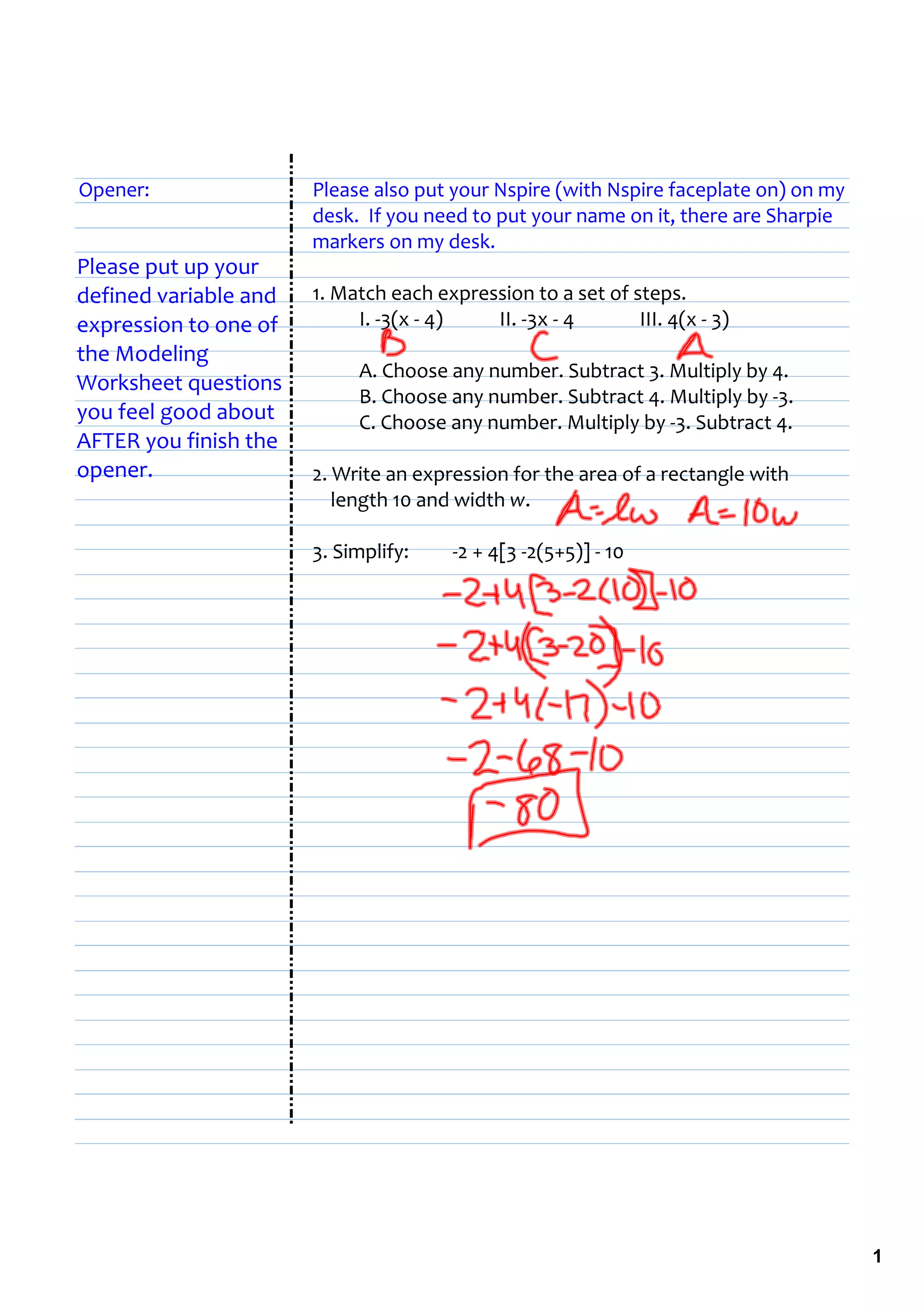 This document contains instructions for students to complete various math exercises on their TI-Nspire calculators. It asks students to match expressions to steps, write an expression for the area of a rectangle, simplify an algebraic expression, evaluate expressions for different variable values, and complete an activity on their calculators worth daily work points. Students are told to work with partners but can ask other group members for help if needed and to raise their hand once finished.