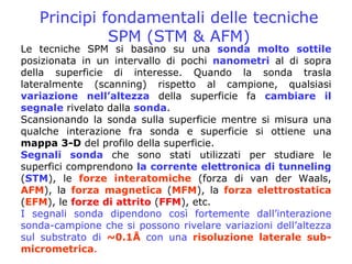 Il documento descrive le tecniche di microscopia a scansione (SPM), come STM e AFM, che utilizzano sonde per mappare la topografia e le proprietà dei materiali a livello atomico. Viene spiegato il funzionamento di strumenti per misurare forze interatomiche e per identificare materiali attraverso processi come l'indentazione e la spettroscopia di forza. Inoltre, si trattano applicazioni in ambito chimico e biologico, come l'identificazione del DNA tramite il monitoraggio delle interazioni tra sonde e campioni.
