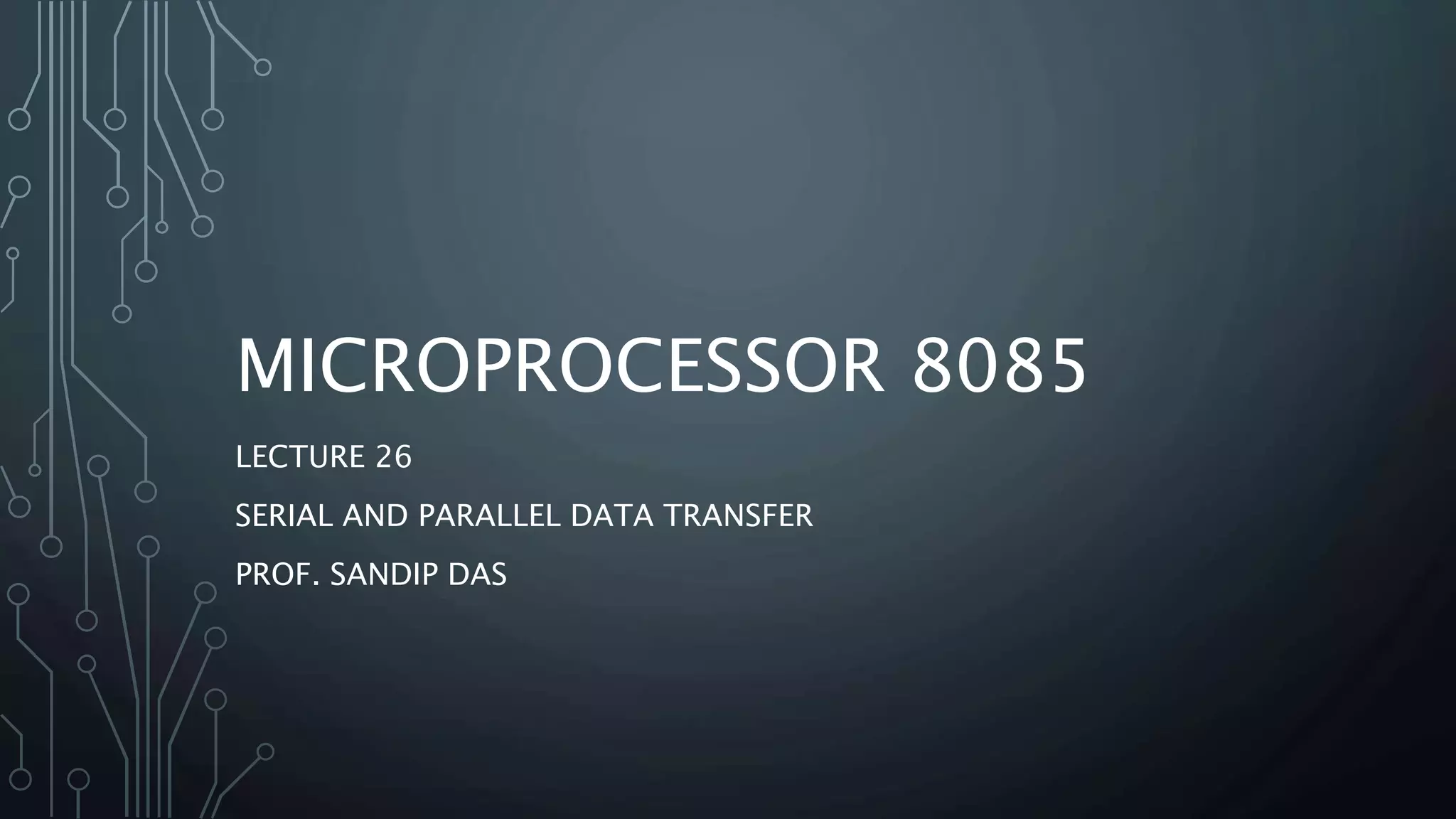 This document discusses serial and parallel data transfer modes in microprocessors. It focuses on the 8085 microprocessor. There are two main modes: parallel I/O mode where the 8085 communicates directly with I/O devices using its full data bus, and serial I/O mode where it uses a converter and single data line. Serial I/O involves asynchronous or synchronous transmission formats, with asynchronous using start and stop bits to delineate characters. The 8085 has two pins, SOD and SID, for software-controlled serial I/O using the SIM and RIM instructions to output and input single bits of serial data.