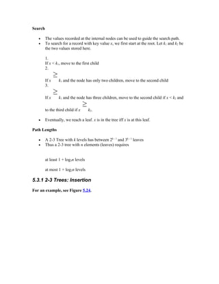 The document summarizes 2-3 trees, which are binary search trees where each internal node has either 2 or 3 children. It describes the structure of internal and leaf nodes, and provides algorithms for searching, inserting, and deleting elements in 2-3 trees. Searching follows the structure of the tree to guide the search path. Insertion may split nodes or increase the tree height, while deletion may merge nodes or decrease the height.