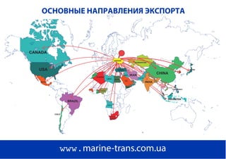 Документ представляет собой информацию о компании ООО 'Марин-Транс', занимающейся международными морскими контейнерными перевозками, включая статистику экспортно-импортных операций Украины с различными странами. Приведены данные о стоимость и время доставки грузов, а также торгово-экономические отношения между странами. Указаны основные экспортируемые и импортируемые товары, возможности доставки и различные условия перевозки.