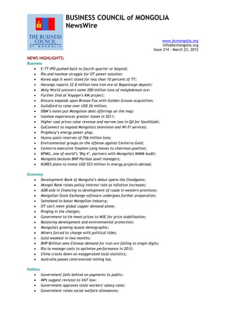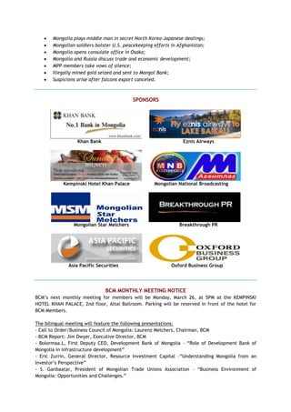 The document is a newsletter from the Business Council of Mongolia that includes the following highlights: