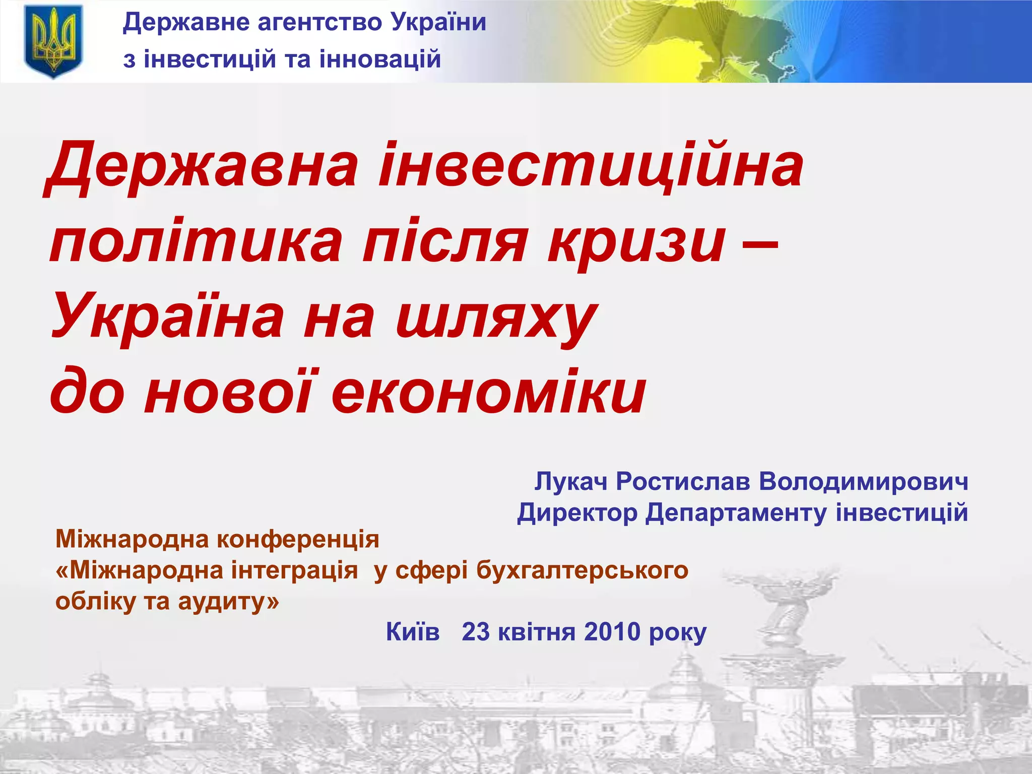 Державне агентство Українизінвестицій та інноваційДержавна інвестиційна політика після кризи – Україна на шляхудо нової економікиЛукач Ростислав ВолодимировичДиректор Департаменту інвестиційМіжнародна конференція «Міжнародна інтеграція у сфері бухгалтерського обліку та аудиту»Київ 23 квітня 2010 року1