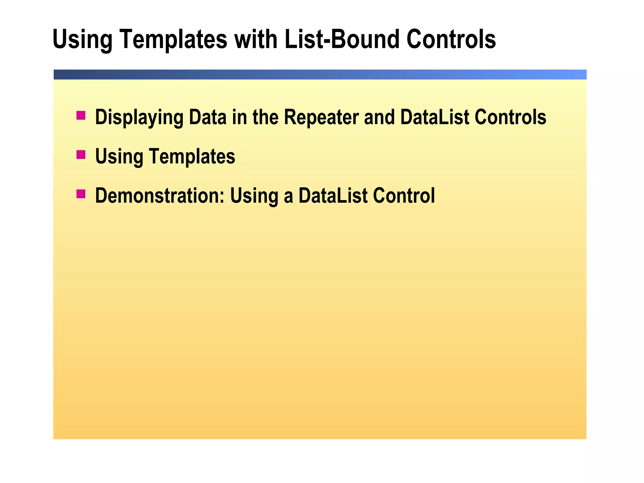 The document discusses using templates with list-bound controls like the Repeater and DataList in ASP.NET to display data. It describes creating the controls, binding them to a data source, setting properties, and using templates like ItemTemplate, FooterTemplate, and HeaderTemplate to display the data. As an example, it demonstrates using a DataList control to display data through templates.