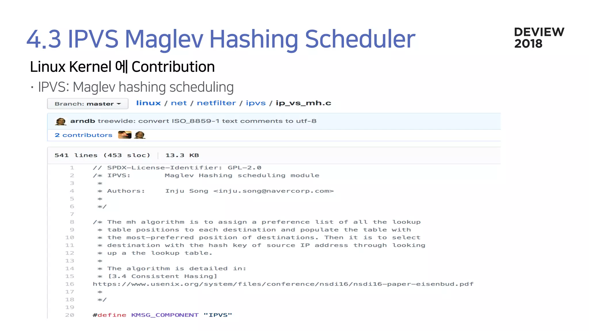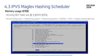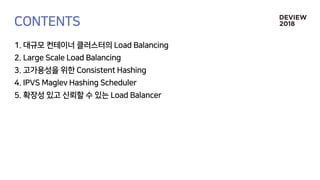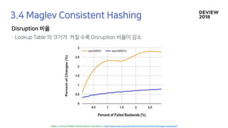 The document discusses the architecture and functionality of a load-balancing system involving container clusters and hosts. It emphasizes high availability, efficient load balancing techniques, and the use of IPVS with Maglev hashing scheduler for handling traffic. It also outlines connection management during load balancer disruptions and suggests dynamic updates to the IPVS configuration for reliability.