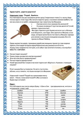 В документе описывается недельная глава Торы, в которой изучаются законы шаббата, строительство мишкана и дары, принесенные народом Израиля. Также упоминаются занятия детей, включая изучение новой буквы, творческую деятельность и математические игры, связанные с темой весны. Итогом недели стало активное участие детей в учебном процессе и играх на свежем воздухе.