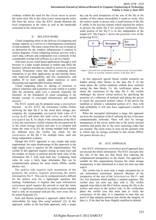 The document proposes a system called ICCC (Information Correctness to Customers in Cloud Data Storage) that provides a proof of correctness to customers storing data in the cloud. This ensures the cloud storage provider has not modified the customer's data without approval. The system aims to verify correctness with minimal storage/computation at the client and cloud server sides and low bandwidth usage. It allows verification using only a small portion of the stored data file, independent of the file size. The ICCC proof could be included in service level agreements to assure customers of their data's integrity in the cloud.