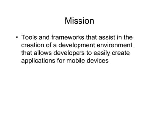 The document discusses Tools for Mobile Linux (TmL), an Eclipse project that provides tools and frameworks for developing mobile applications. It provides an overview of TmL's history and goals, describes some of its key technologies, and outlines plans for future development and involvement with the mobile Linux community. Contact information is provided for getting involved with the TmL project.