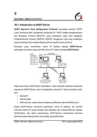 Dokumen ini memberikan gambaran tentang Dynamic Host Configuration Protocol (DHCP), yang secara dinamis menyediakan alamat IP untuk perangkat yang terhubung ke jaringan. Proses pengalokasian alamat IP melibatkan empat langkah utama: DHCPDISCOVER, DHCPOFFER, DHCPREQUEST, dan DHCPACK. Selain itu, juga menjelaskan cara menginstal dan mengkonfigurasi server DHCP serta cara mengelola basis data DHCP.
