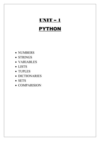This document provides an overview of key Python concepts including numbers, strings, variables, lists, tuples, dictionaries, and sets. It defines each concept and provides examples. Numbers discusses integer, float, and complex data types. Strings covers string operations like accessing characters, concatenation, formatting and methods. Variables explains variable naming rules and scopes. Lists demonstrates accessing, modifying, and sorting list elements. Tuples describes immutable ordered collections. Dictionaries defines storing and accessing data via keys and values. Sets introduces unordered unique element collections.
