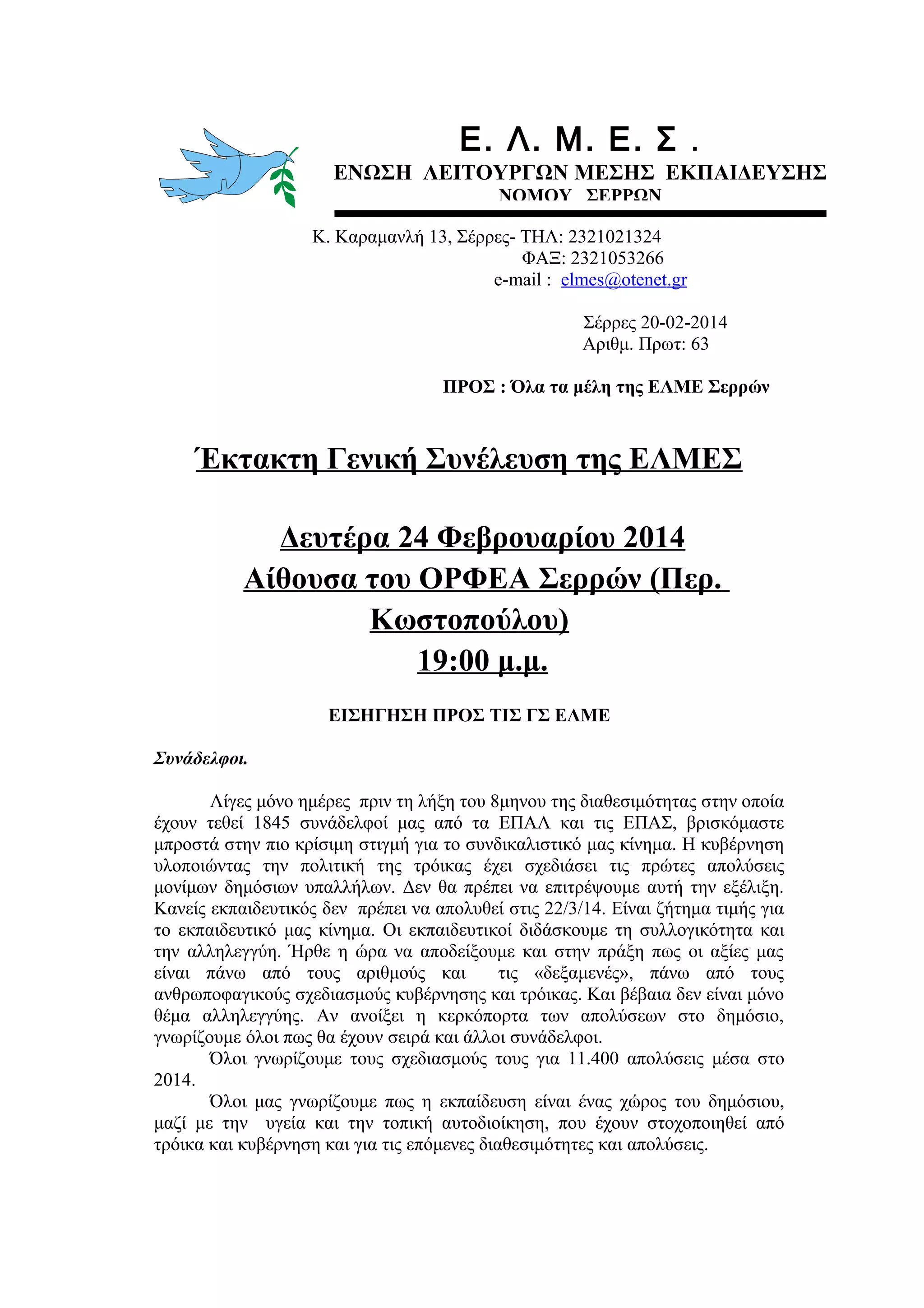 ΠΡΟΣ : Όλα τα μέλη της ΕΛΜΕ Σερρών