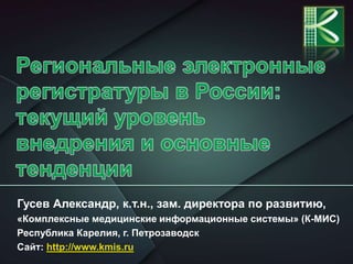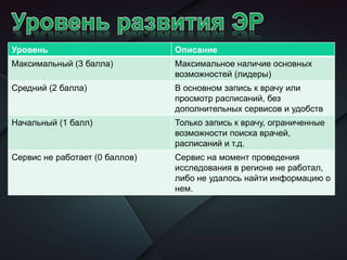 Документ представляет анализ состояния сервисов записи к врачу и электронных регистратур в России на основе данных за 2010 и 2015 годы. Основное внимание уделяется уровню развития сервисов в различных регионах, а также влиянию импортозамещения и интеграции с госуслугами. В результате, 81% регионов имеют работающие интернет-сервисы для записи к врачу, но существуют проблемы с финансированием и оказанием услуг.