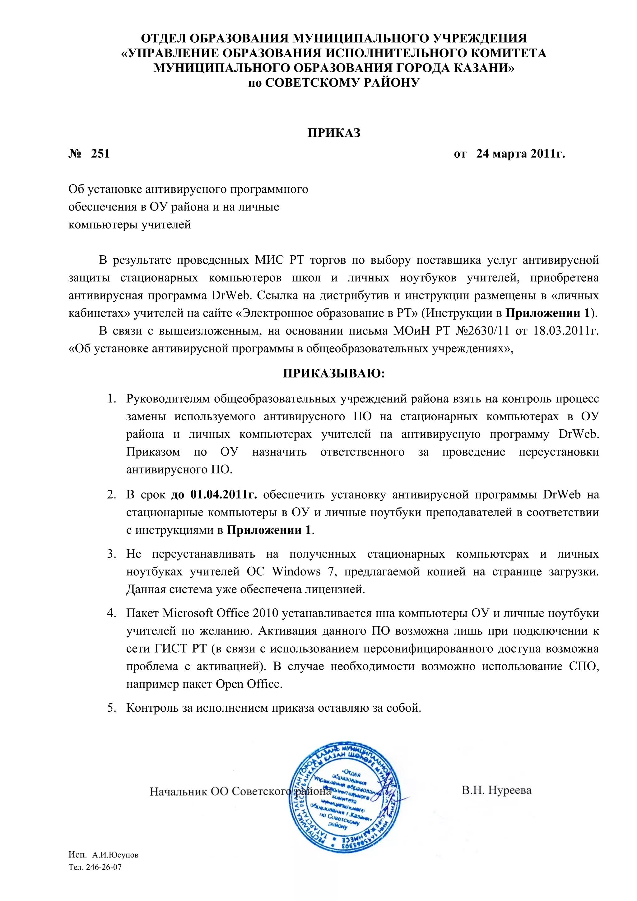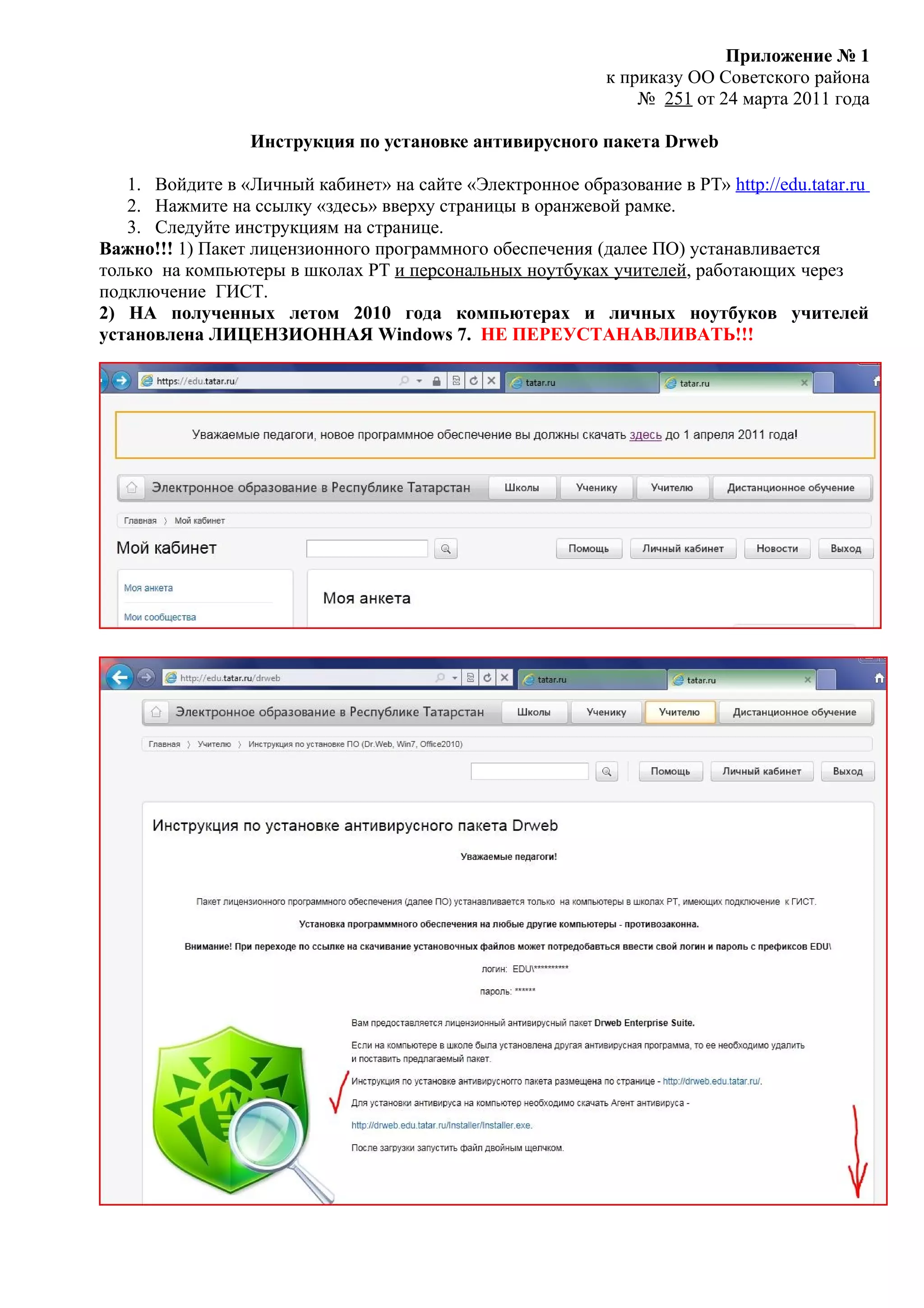 Приказ № 251 от 24 марта 2011 года об установке антивирусного программного обеспечения DrWeb в общеобразовательных учреждениях района предполагает контроль за заменой антивирусного ПО на всех компьютерах и ноутбуках учителей. Установку необходимо завершить до 1 апреля 2011 года, при этом на компьютерах с Windows 7 переустановка не допускается. Инструкции для установки и активации ПО размещены в 'личных кабинетах' учителей на сайте 'электронное образование в РТ'.