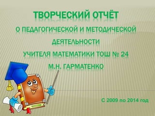 Документ представляет собой творческий отчет о педагогической и методической деятельности учителя математики Гарматенко М.Н. за период с 2009 по 2014 год, акцентируя внимание на деятельностном подходе к преподаванию математики. Он включает описание множества применяемых технологий обучения, успешных участий в конкурсах и достижений учащихся, а также открытые уроки и мероприятия. Основные результаты учеников и достижения в различных конкурсах подчеркивают эффективную работу учителя и его воздействие на учеников.