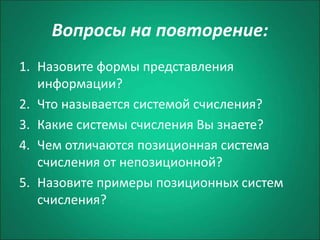 Документ описывает электронную таблицу как прикладную программу для автоматизации ввода и редактирования табличных данных, и ее историю создания, начиная с 1982 года. Также рассматриваются основные функции, структура электронной таблицы и ее типы данных, включая различия между позиционными и непозиционными системами счисления. В конце представлены вопросы на повторение для закрепления материала.
