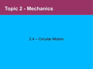 This document discusses circular motion and centripetal acceleration. It defines centripetal acceleration as the acceleration an object experiences when moving in a circular path, which causes a change in the direction of motion towards the center of the circle. The document provides equations for centripetal acceleration, relating it to the object's velocity, radius of the circular path, and angular speed. Examples are given of forces that provide centripetal acceleration, such as gravity keeping the moon in orbit or friction keeping cars from slipping outward while turning.